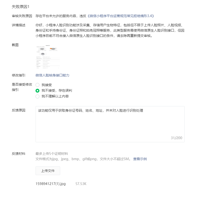 实际上小程序没有使用到人脸识别功能。就只有上传身份证照并识别姓名地址和身份证号省去用户填写步骤,但是上传审核时一直被拒绝,说不符合人脸识别功能。如果这个功能涉及到接入使用人脸识别接口的条件,请问怎么样才能有这个条件???????