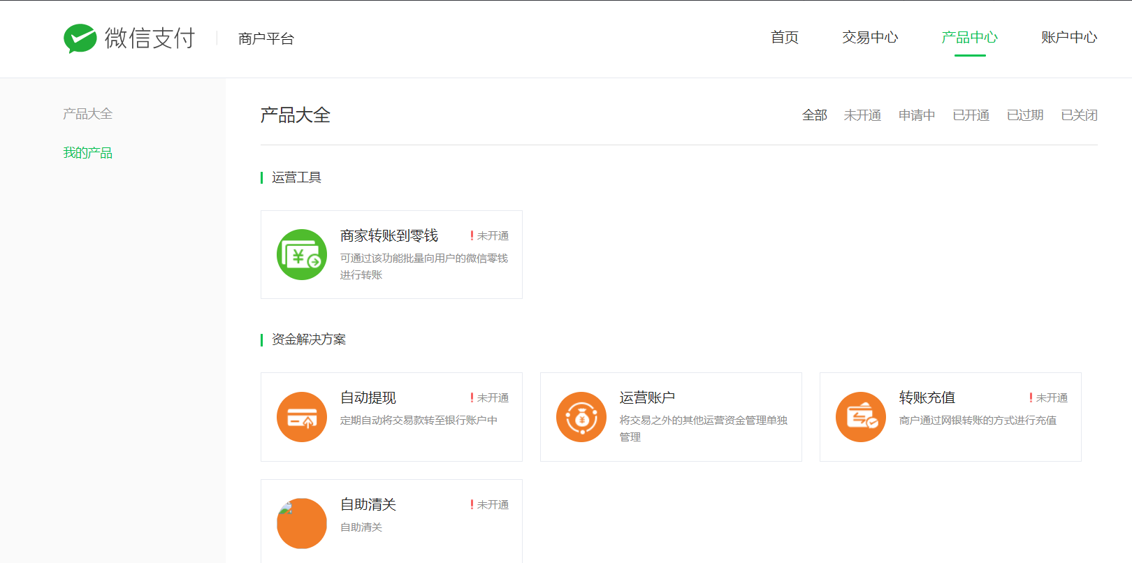然后在商户平台登陆这个商户号,产品中心并没有APPID授权管理这个选项,因此无法确认解绑,小程序迁移卡在这里无法进行后续操作。