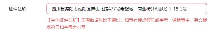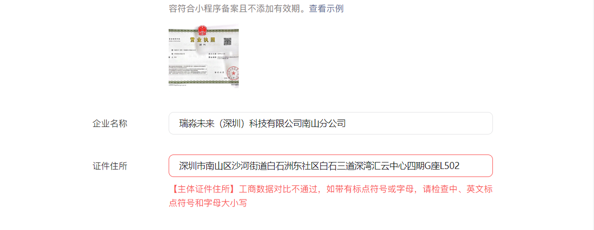 小程序备案 填写主体地址显示与工商数据对比不一致