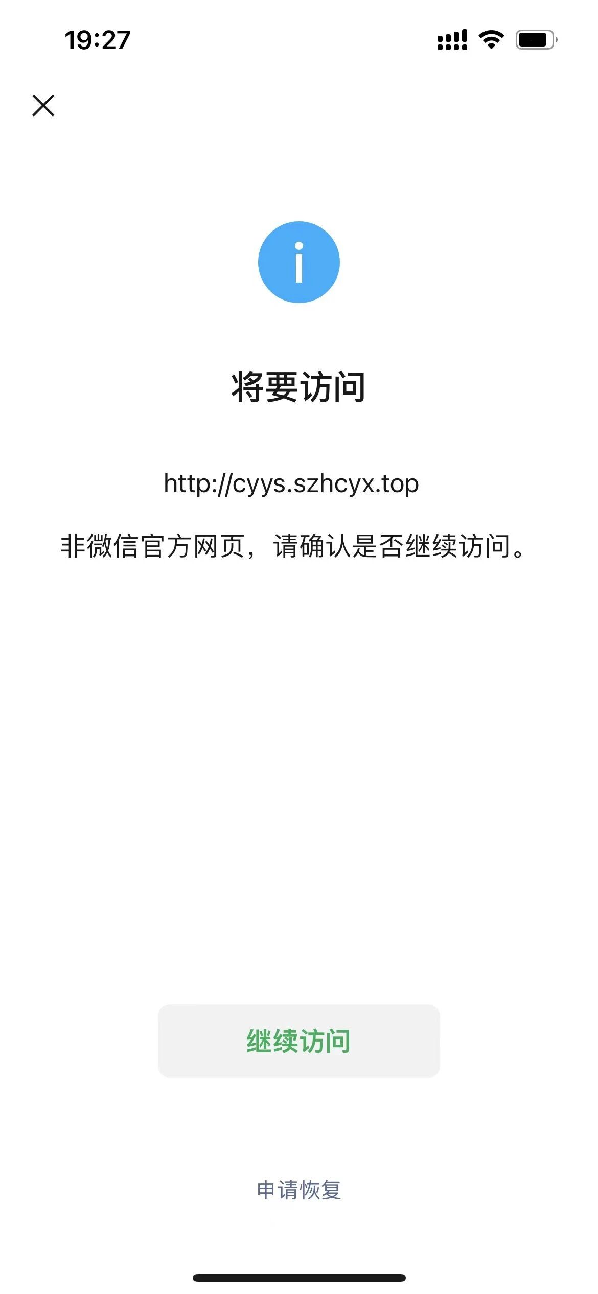 子域名cyys.szhcyx.top,已经备案,并且网站内容是给内部员工发放中秋月饼卡领取。 请马上帮忙解除,非微信官方网页,请确认是否继续访问的提示。目前已经影响我们公司的信誉问题,谢谢啦