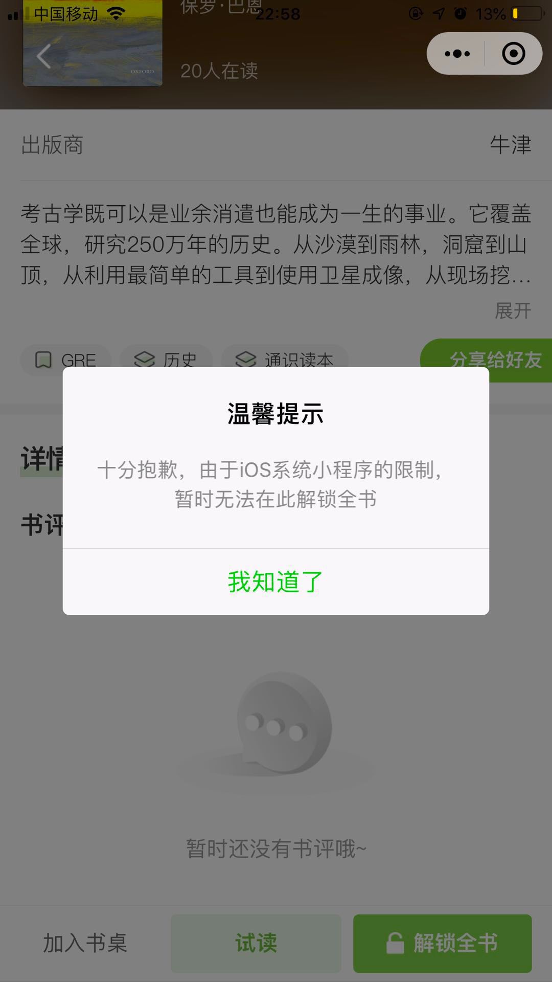 小程序书籍详情页面点击【解锁全书】提示:由于iOS系统小程序的限制,暂时无法在此解锁全书,可修改文案为:“由于相关规范,iOS功能暂不可用”。请修改后再提交代码审核。