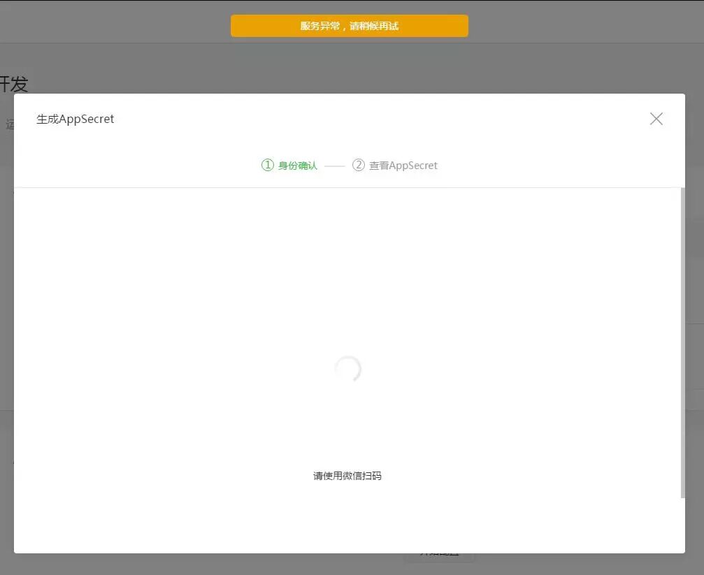 小程序生成AppSecret(小程序密钥)时,提示“服务异常,请稍后再试”,然后扫二维码,虽然提示成功,但是电脑端二维码没有改变