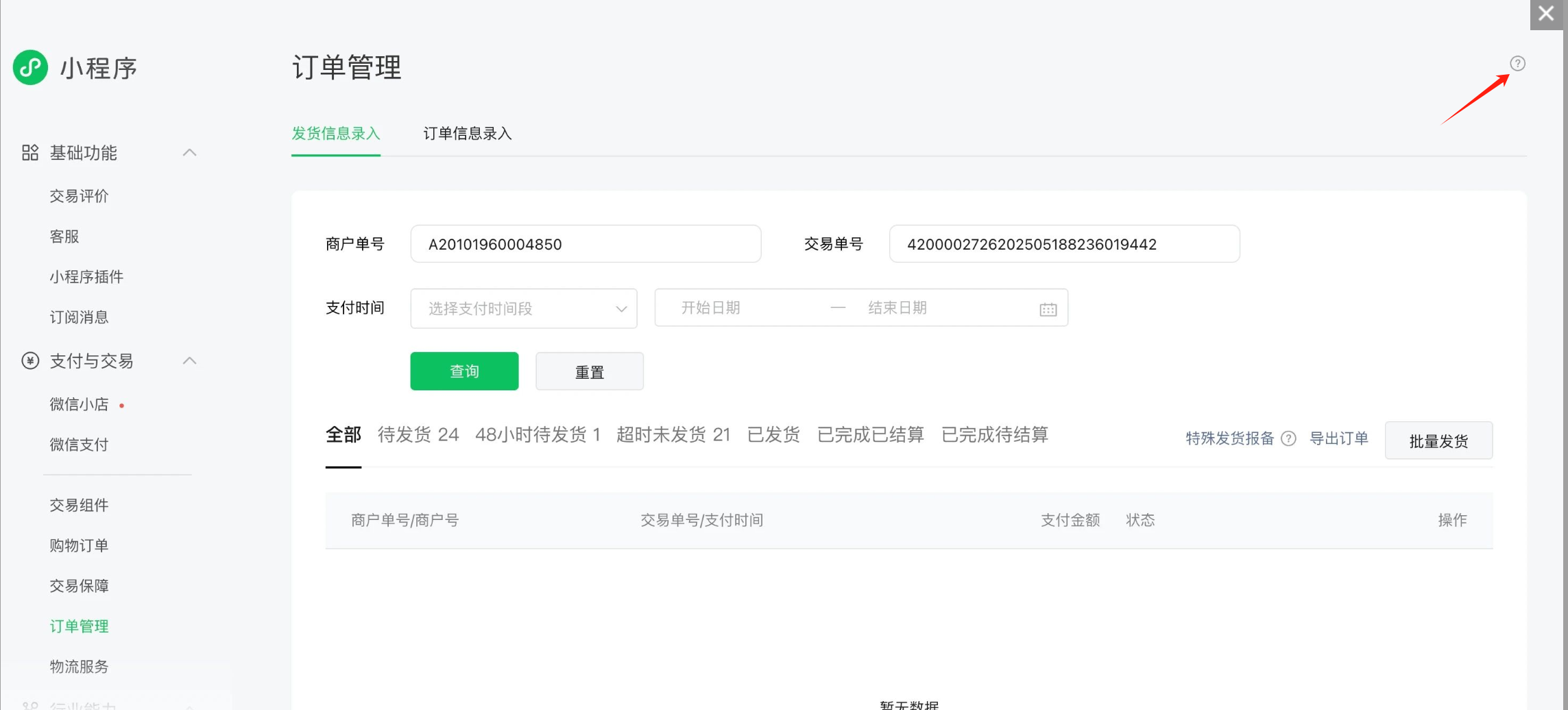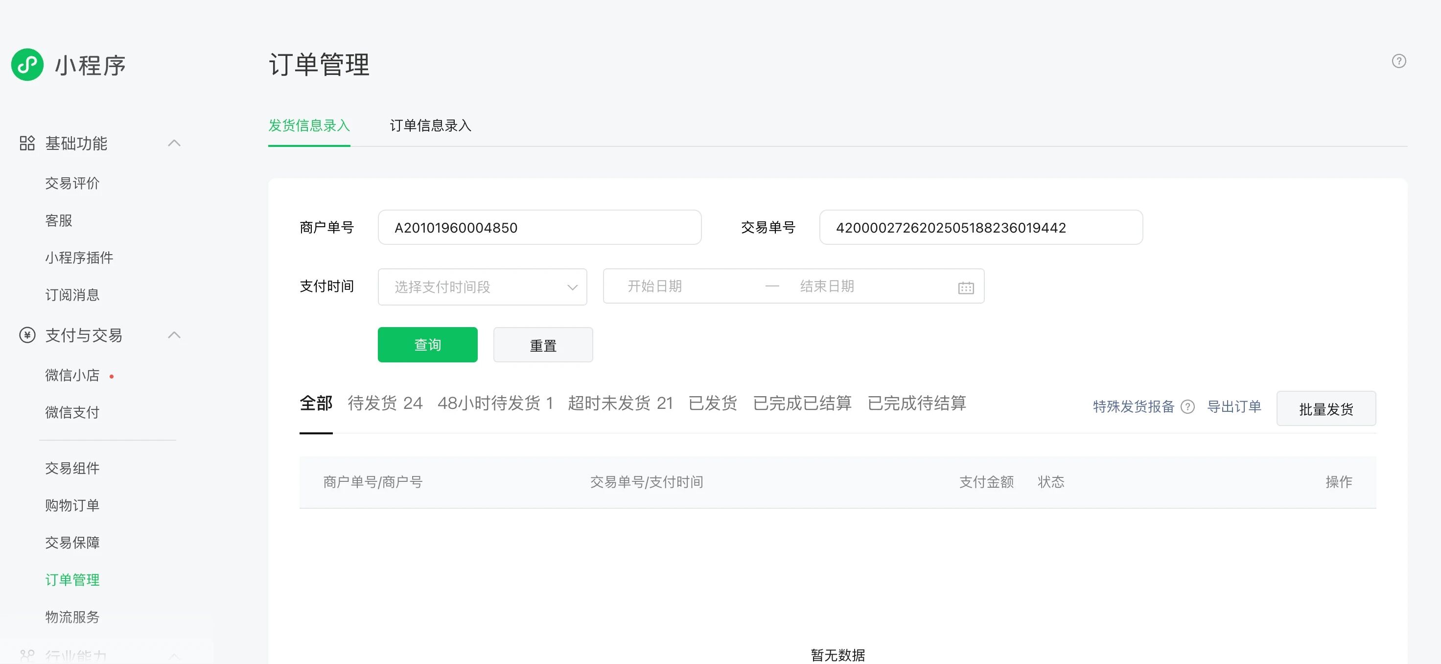 在调用录入发货信息接口和获取发货信息接口时返回“支付单不存在”