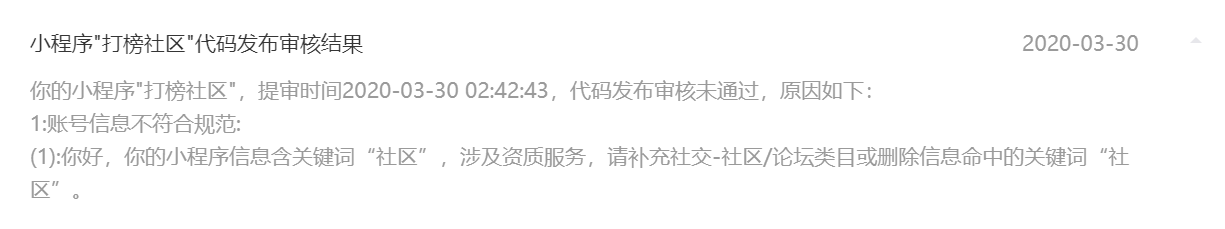 1、提交小程序审核,审核说小程序含关键词“社区”,涉及资质服务,请补充社交-社区/论坛类目