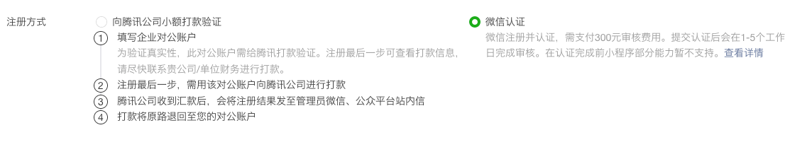 如果以企业身份注册小程序账号的话,注册期间有两个选项,1是对公打款认证、2是微信认证(支付300元)