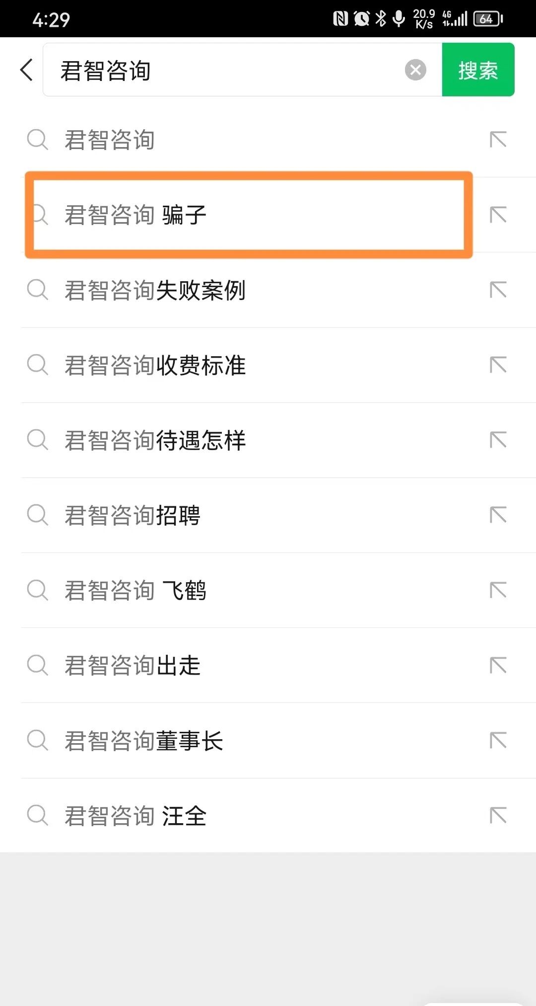 在微信搜一搜当中搜索“君智咨询”,下拉词中包含“君智资讯 骗子“,该信息不实信息,对我们公司声誉造成影响,望微信团队能够给予处理,感谢!