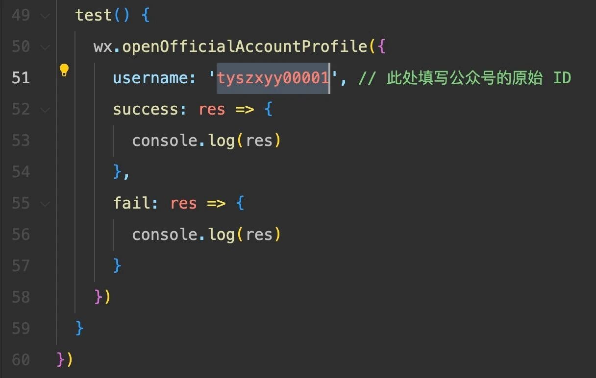 ()里面应该是对象吧 uni.openOfficialAccountProfile({username:'tyszxyy00001'})