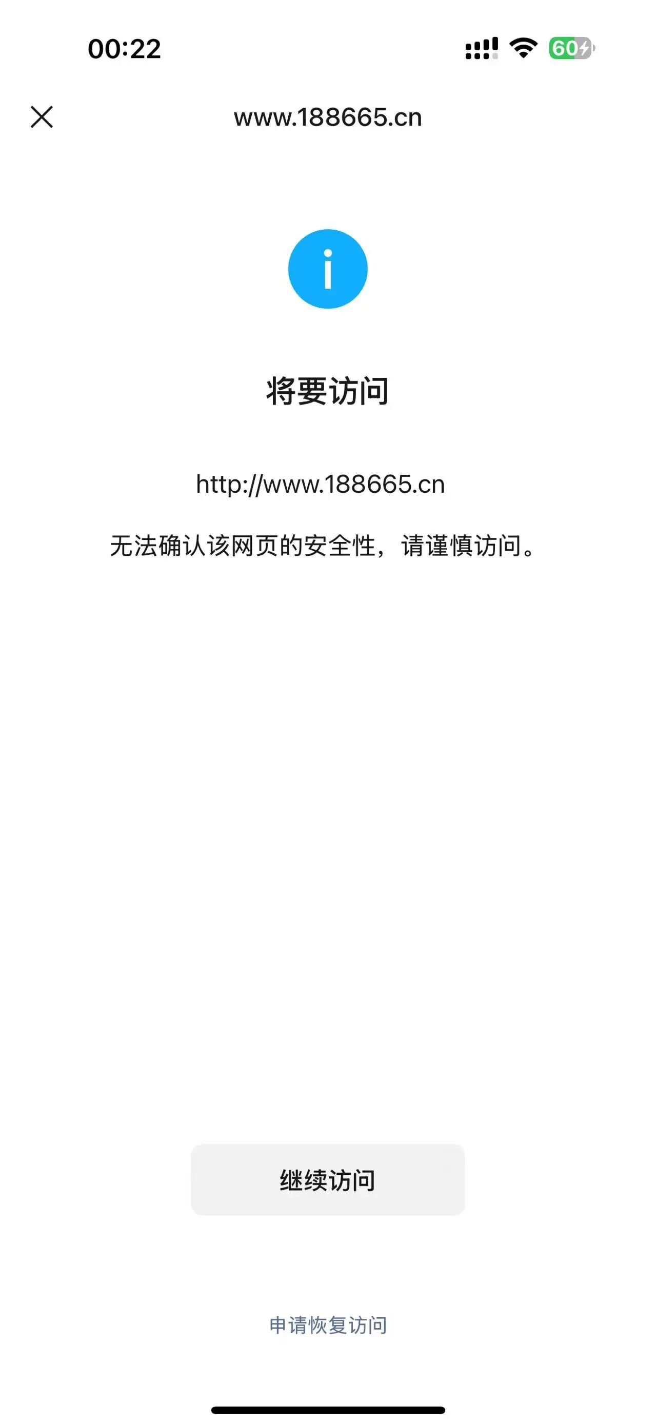 在微信里面访问我们网站:www.188665.cn 一直提示”非微信官方网页,请确认是否继续访问“,麻烦帮忙解决一下,相关信息如下: