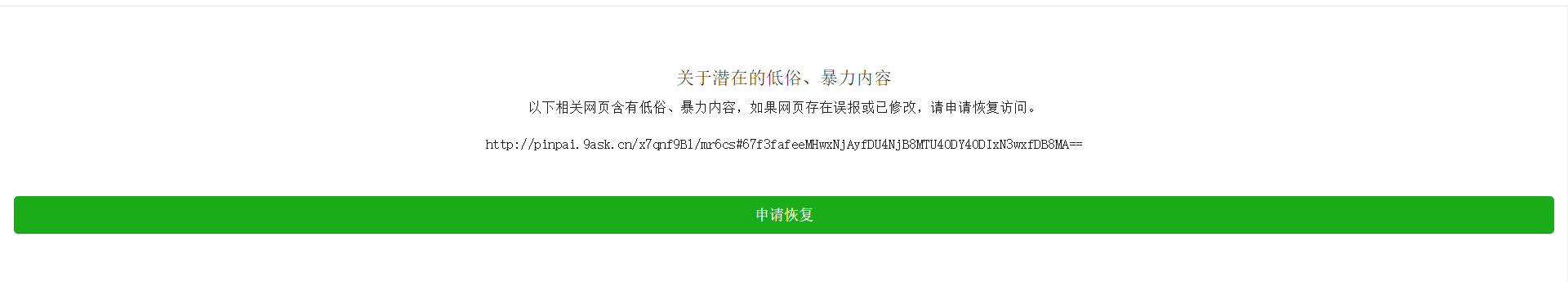 我们公司的网站在微信里访问提示已停止访问该网页,点申诉提示http://pinpai.9ask.cn/x7qnf9Bl/mr6cs#67f3fafeeMHwxNjAyfDU4NjB8MTU4ODY4ODIxN3wxfDB8MA== 页面关于潜在的低俗、暴力内容,但是此页面实际并不存在,怀疑是被恶意举报,申诉多次也没有得到解决。现已将pinpai.9ask.cn域名下的所有页面都指向静态页面。请求解封,或者给个具体的解决办法。谢谢!