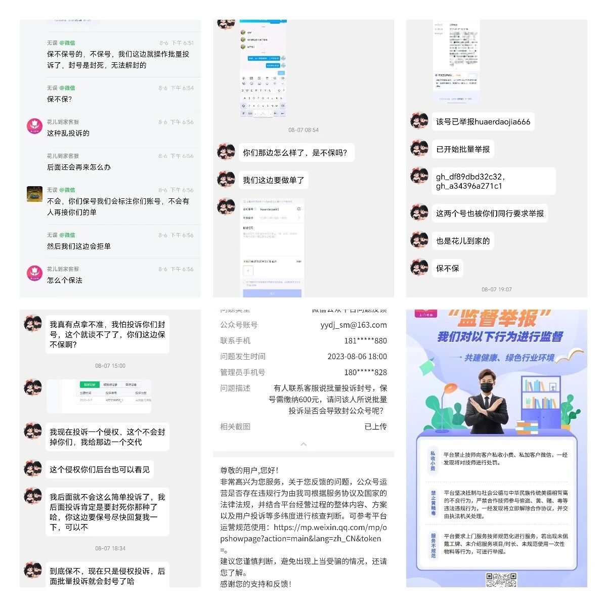 尊敬的腾讯公司审核老师: 我们从8月份起就一直收到敲诈勒索信息,威胁每个号要收取600元,否则将以投诉的方式封号或者限制原创或搜索能力,我们第一时间也像客服进行了报备,我们已收到多次敲诈信息,请贵司明察(截图见证明材料)。我们是正规绿色平台,严厉打击各类不法行为,近日我们再次又遭到了封号勒索,这次我们没有支付费用,就在1月9日早上开始,我们发现我们的品牌词“花儿到家”和文章全部无法搜索到了,且没有任何违规信息和提示。