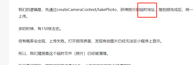 我们的逻辑是,先通过createCameraContext/takePhoto,获得照片的临时地址,等拍照完成后,统一上传。