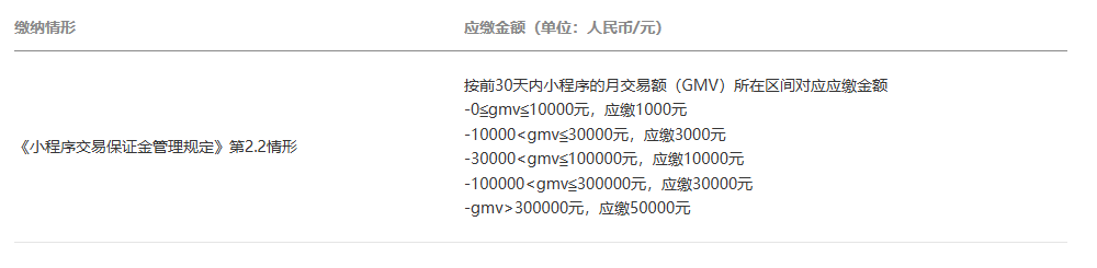 小程序保证金是按照交易额动态计算的,可参考。https://developers.weixin.qq.com/miniprogram/dev/platform-capabilities/business-capabilities/ministore/minishopopencomponent2/baozhengjin.html