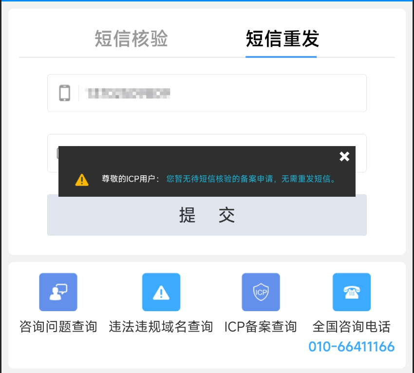 在备案系统中重新触发“发送核验短信”操作,但是提示“暂无待短信核验的备案申请”