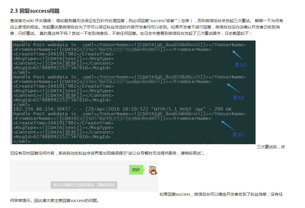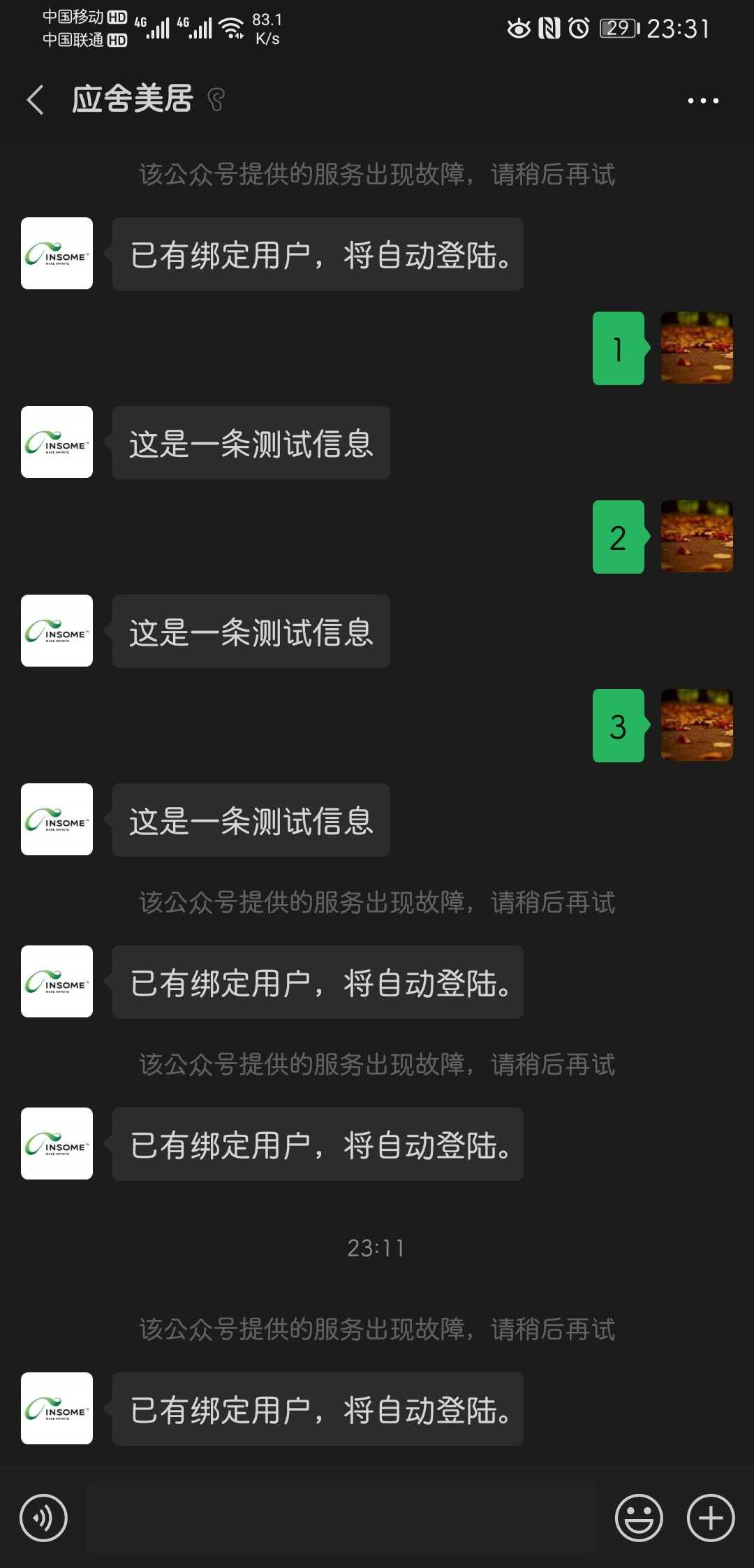 服务器只接收到了一条事件消息,我在服务器储存了Log日志记录,然后用户却收到了两条消息,第一条是提示“该公众号暂时无法提供服务,请稍后再试”,第二条是正确的服务器回复消息“登录成功”,如下图所示。