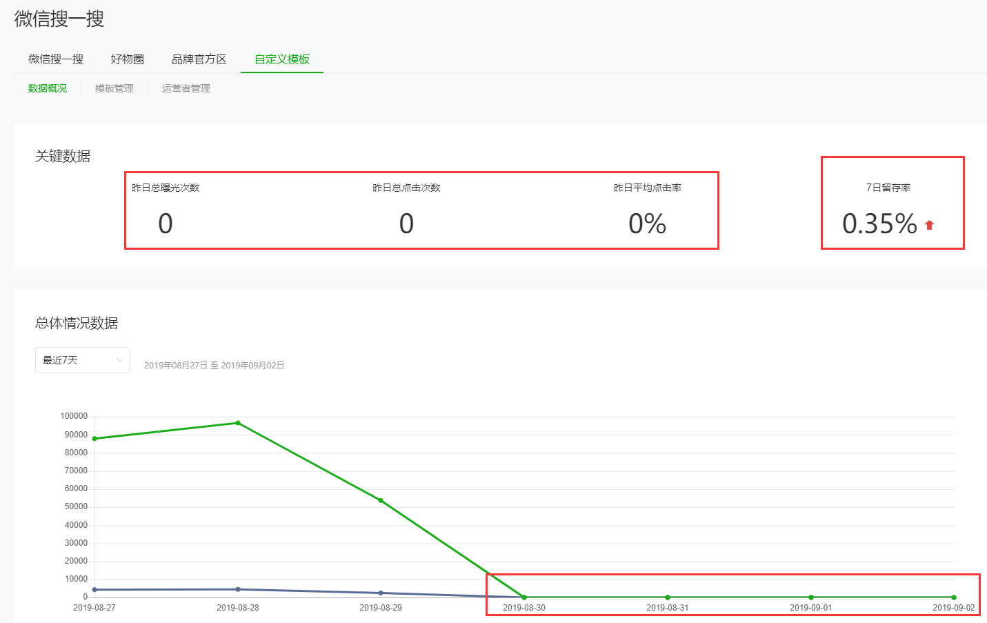 1.昨日关键数据中的曝光次数、昨日总点击次数、昨日平均点击率为0,但是7日留存率不为0。而且昨日我们也有尝试在微信中搜索这两个模板,搜索结果可正常使用。