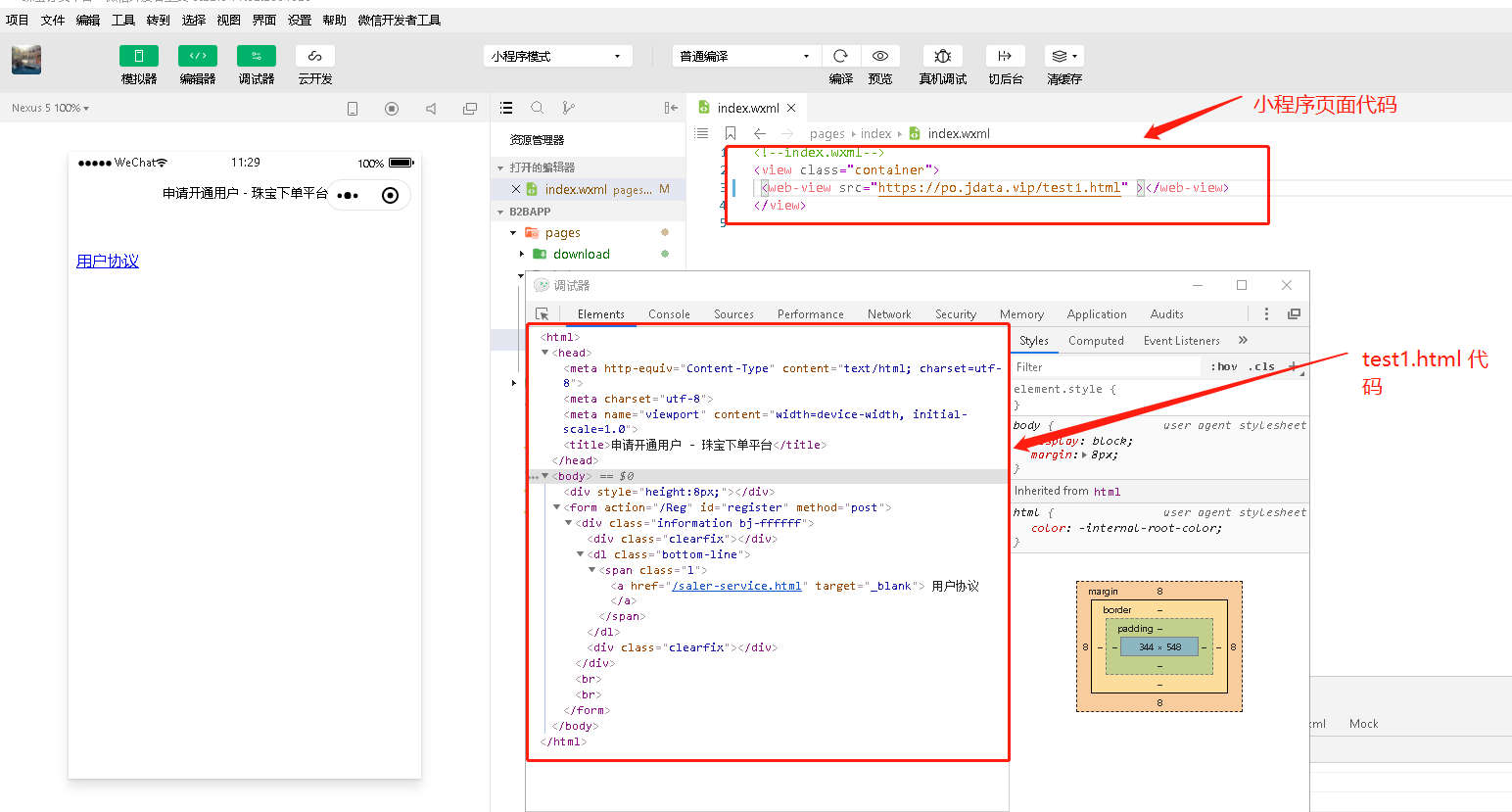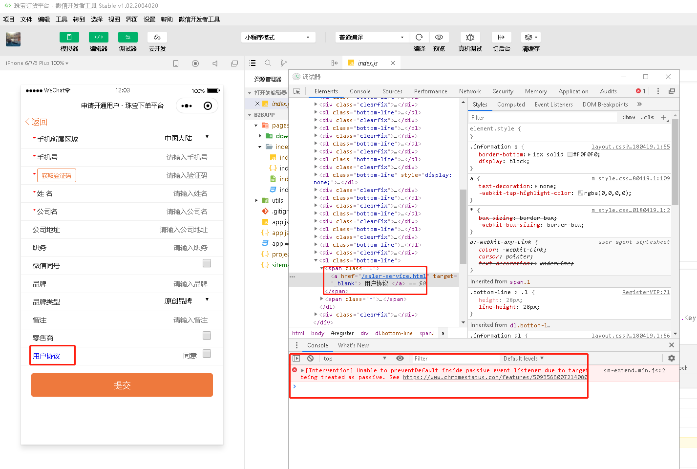 在PC端小程序和微信调试工具里面 点击 "用户协议" 链接,都无反应。