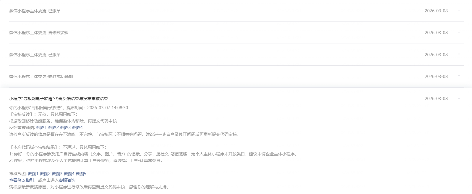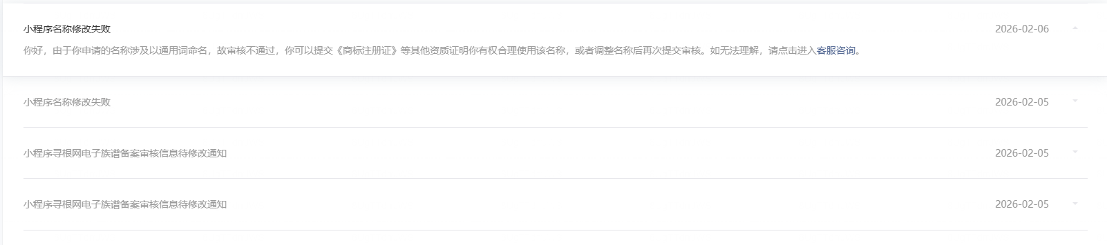 小程序开始起名【寻根网电子族谱】名称注册通过审核,但是到了备案,备案人员一直驳回,来电沟通说个人主体不能使用 xx网 之类的名称,然后我让她给个规范,备案人员说【个人电子族谱】可以通过,于是我提取了改名申请,多次申请都被驳回,理由是名称涉及通用词命名;