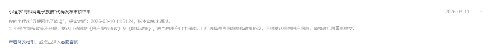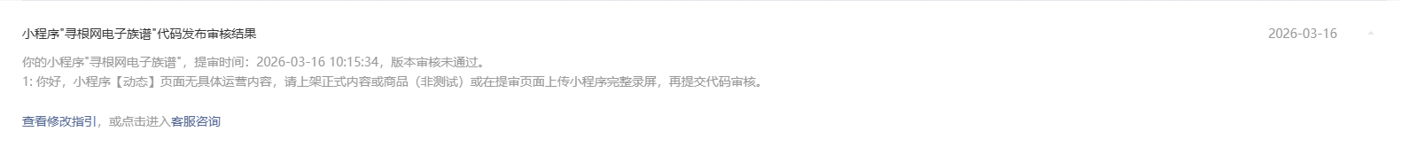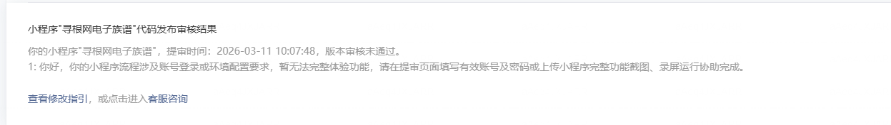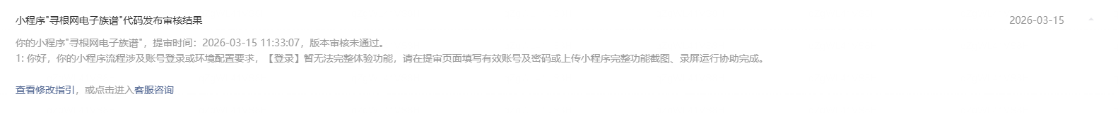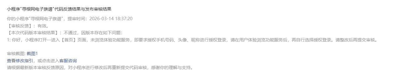 之后还是驳回,理由是一进入首页就要求用户登录,需要让用户体验服务后再自行选择授权登录,又一万匹草泥马飘过,族谱需要知道用户身份才能返回对应的族谱数据,族谱不是商城,我看修改指引里面全是商城类目,我的是工具信息类查询,不能有效识别用户身份如何提供服务,如何查找数据,总不能千篇一律一成不变啊。况且,我的注册并不需要用户提供真实手机号,只是一个账号即可。也未邀请用户提供头像,昵称这些微信的授权信息,为啥就不能?