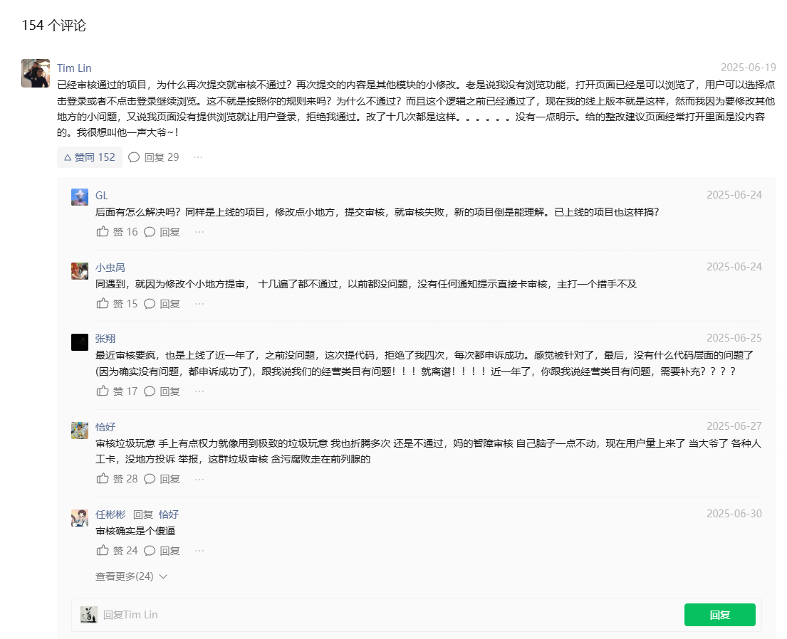 来来回回审核了 10 多个版本,10多天的拉扯,无奈啊,不知道还得等到什么时候才能审核通过,我已经不抱希望了,直接改 app 了。那 300 多的认证费用就当送你们。