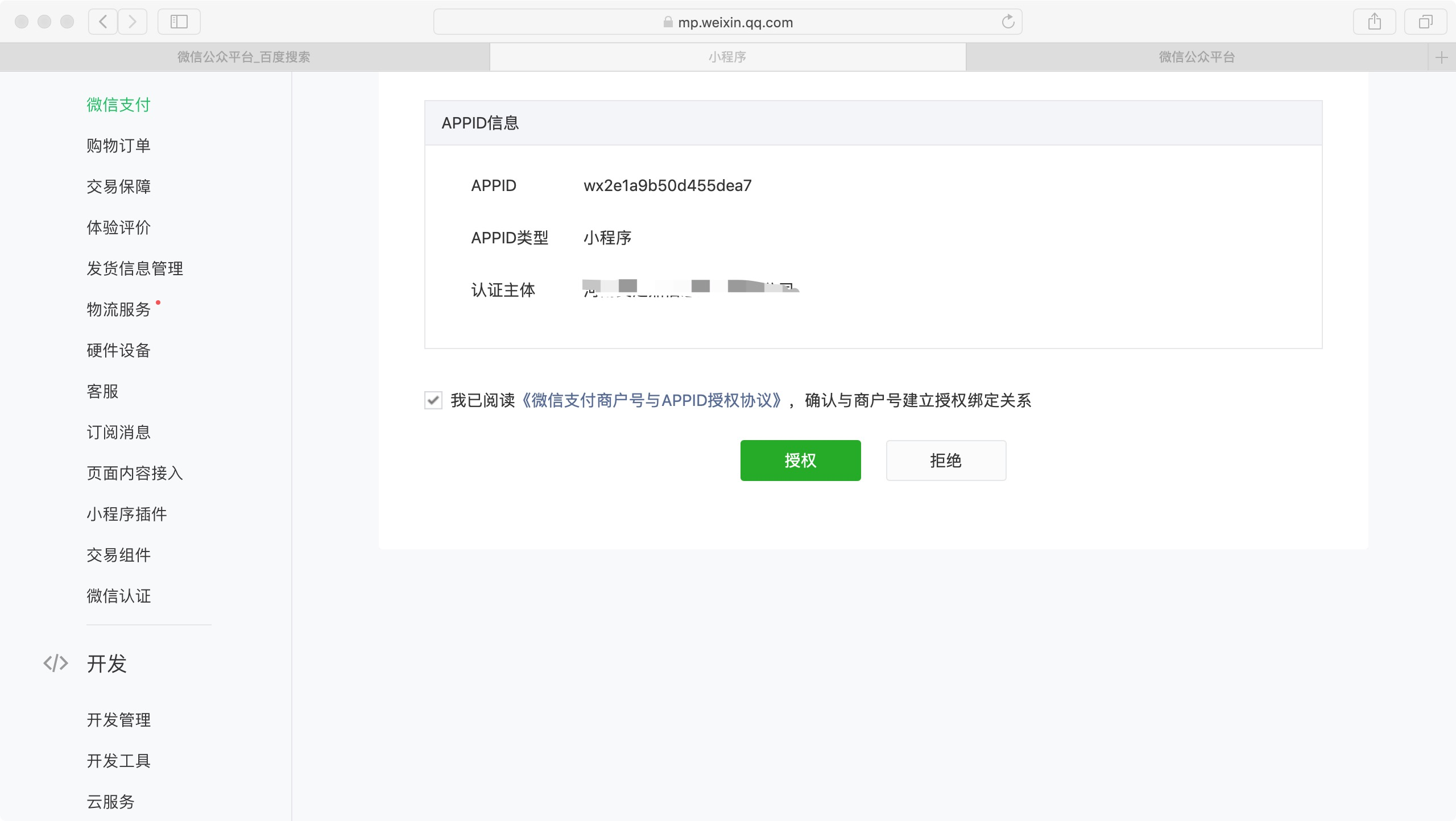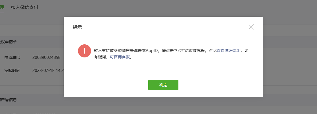 目前电商平台类目已经审核通过,但是在微信支付服务商账号中绑定小程序appid后,在小程序中进行确认的时候提示下面的内容,绑定不上?