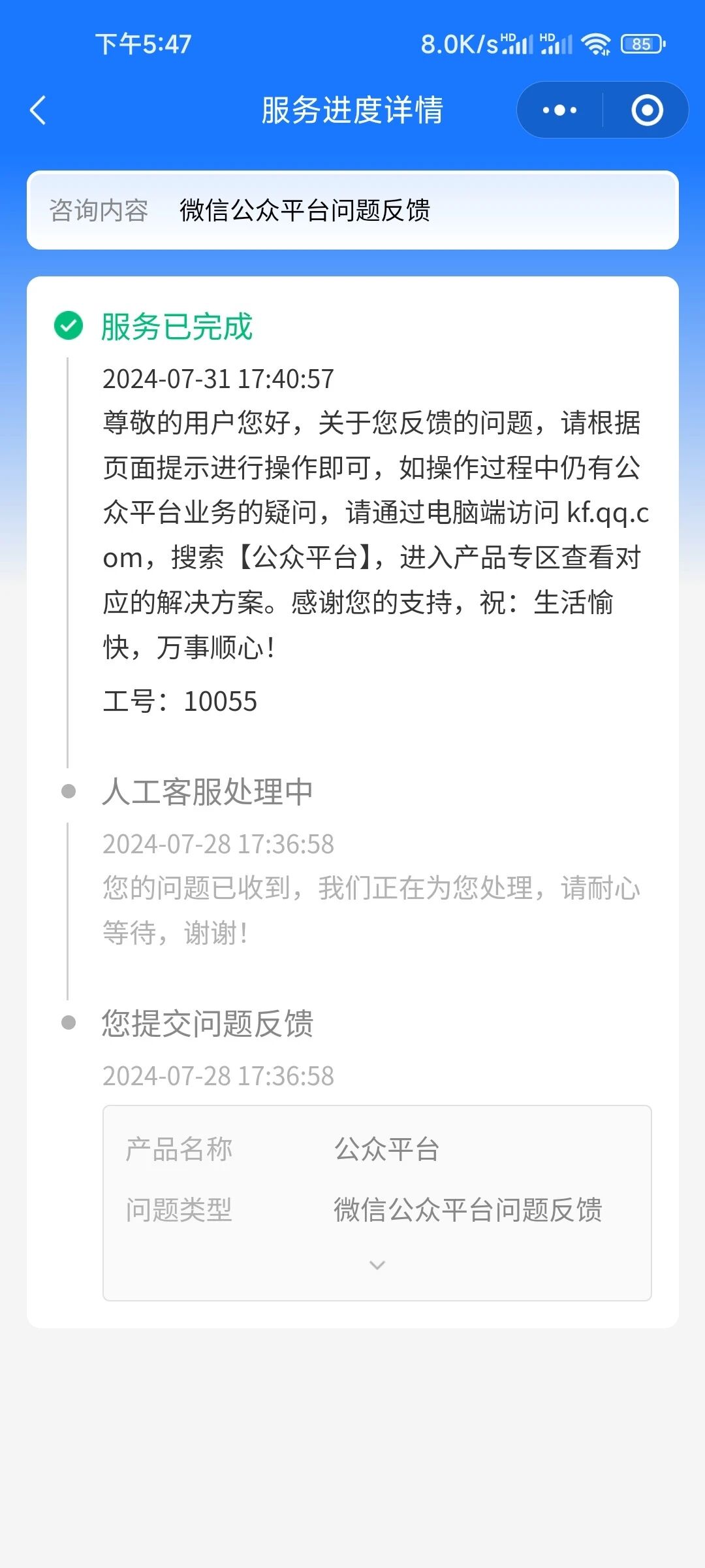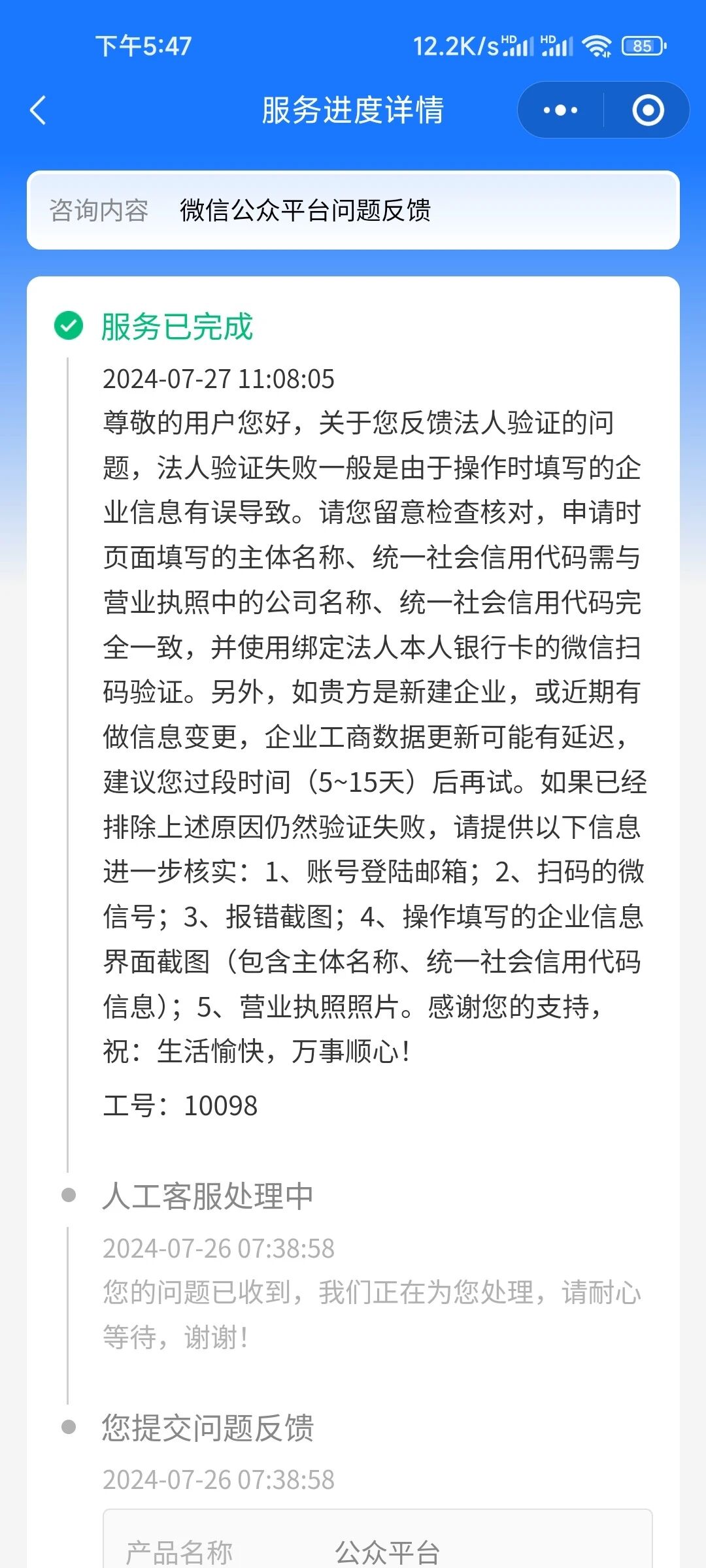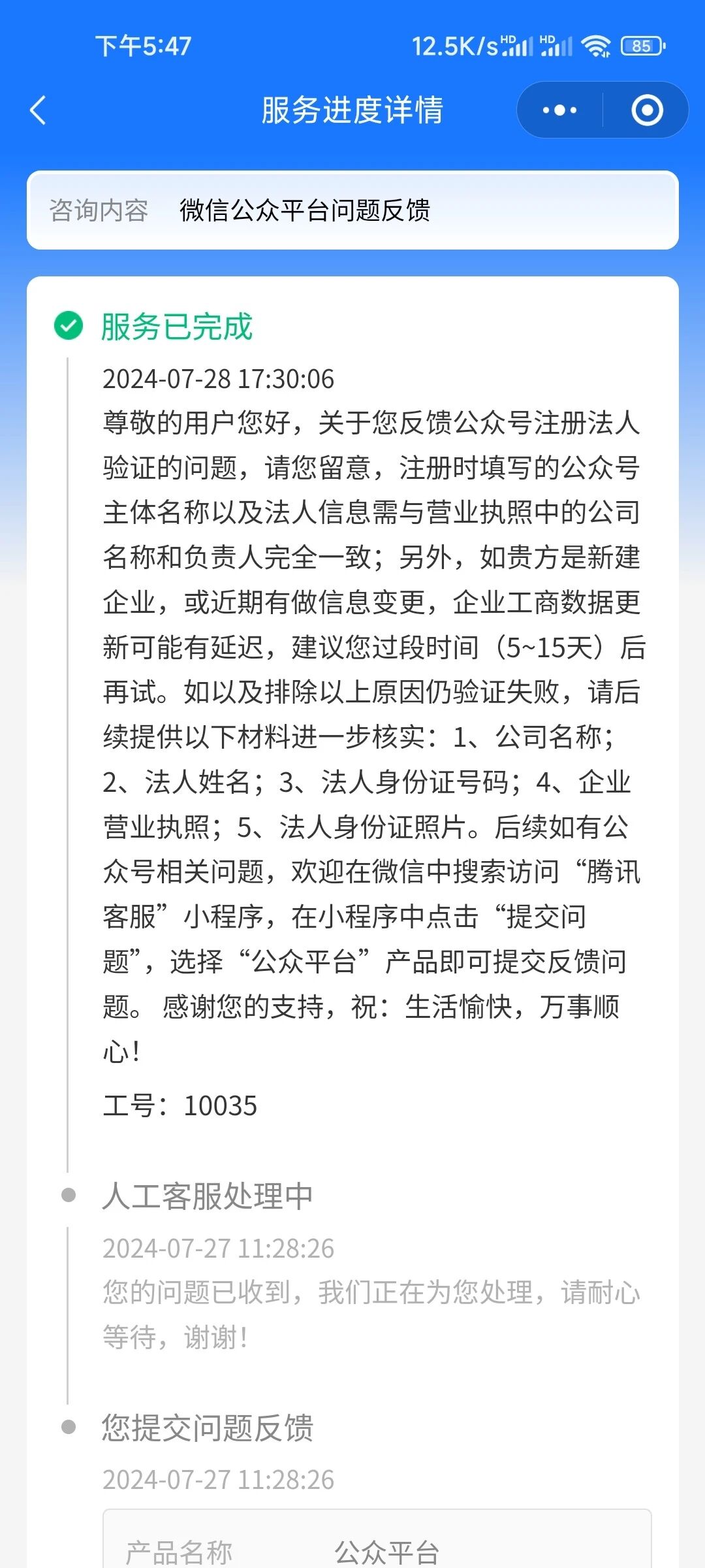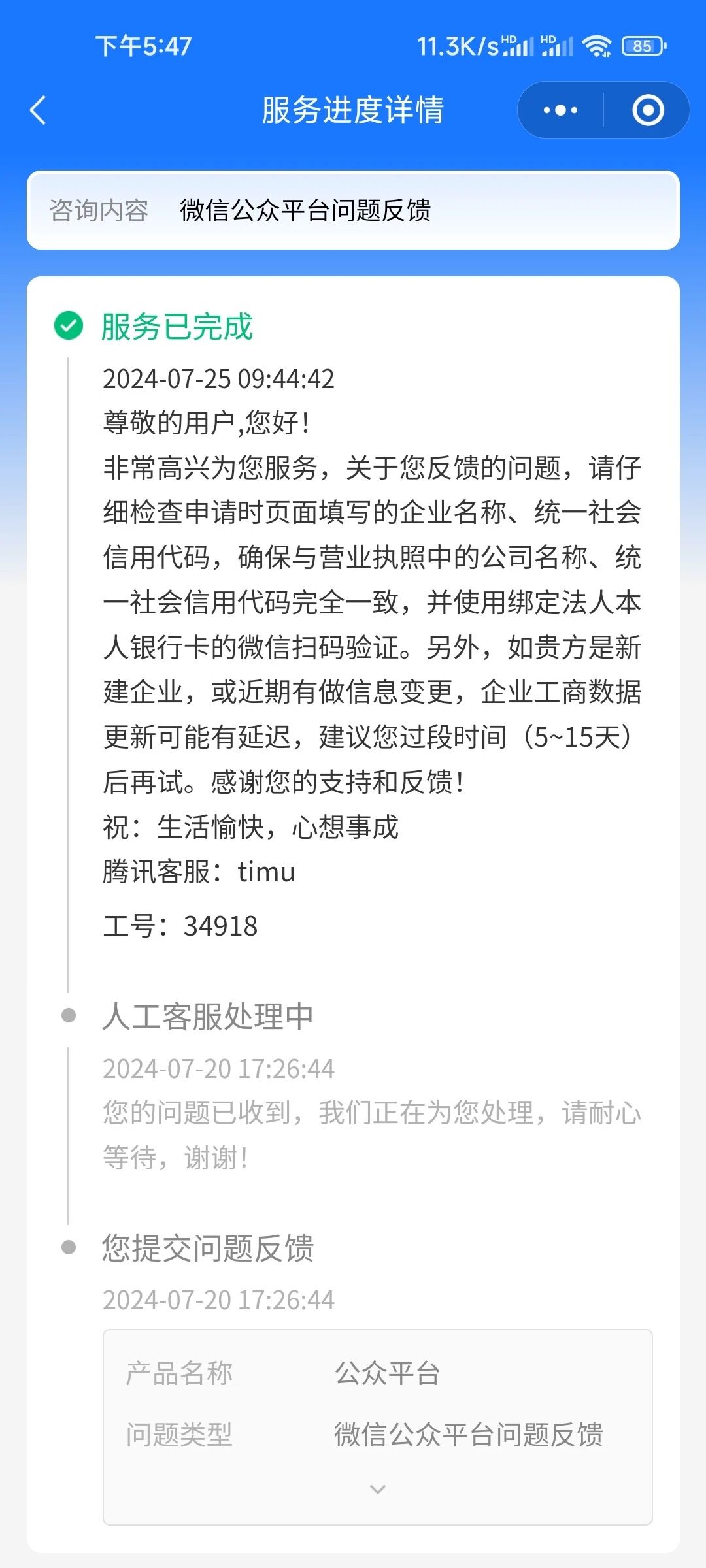 营业执照已经注册超15天,注册公众号时提示企业数据与法定代表人不一致,微信客服渠道提交了相关资料,反反复复都弄不好,最后居然告知我按页面操作即可?客服你是不是傻x?