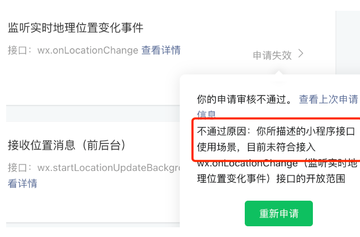 你好,核实到小程序申请wx.onlocationChange接口审核不通过,根据提交的申请信息可知申请该接口是用于【根据用户位置推荐最近门店】,小程序内未含有需监听用户实时运动轨迹的使用场景。不符合wx.onlocationChange接口使用场景开放范畴。详情参考:https://developers.weixin.qq.com/miniprogram/dev/api/location/wx.onLocationChange.html