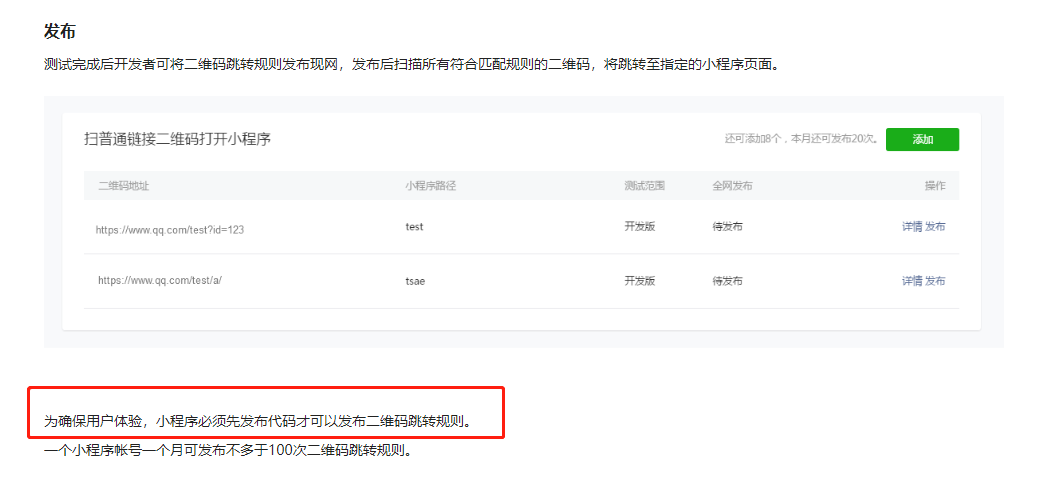 代码没有发布,不能发布该二维码规则, 是只能发布生产嘛, 体验版不行?