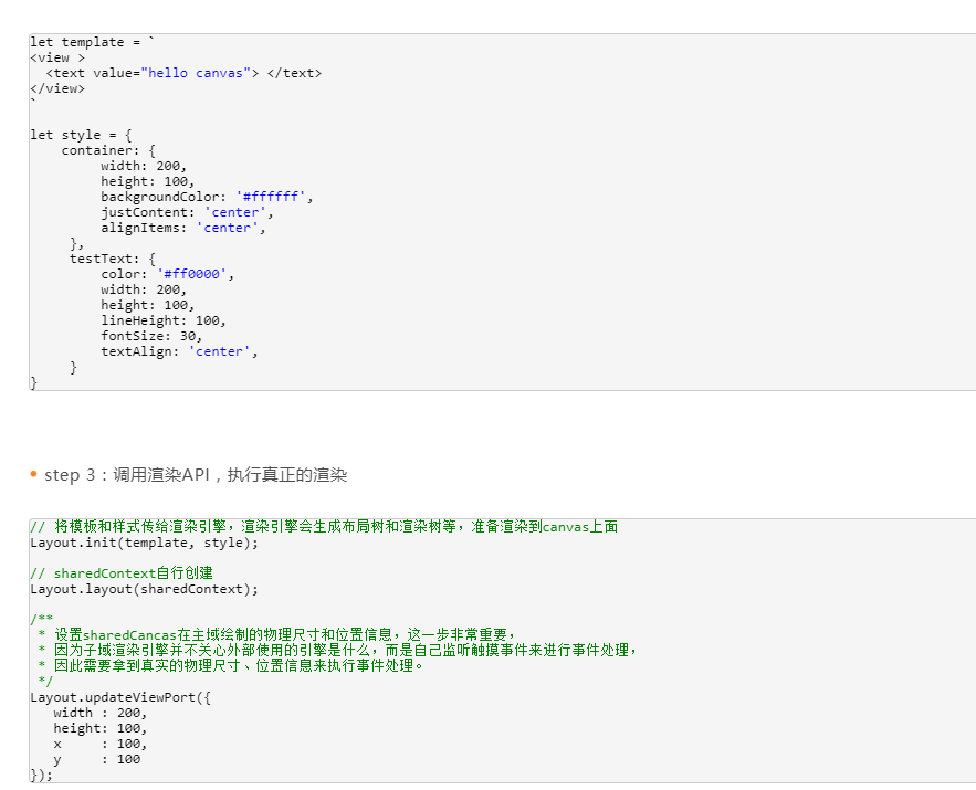 // 将模板和样式传给渲染引擎,渲染引擎会生成布局树和渲染树等,准备渲染到canvas上面 Layout.init(template, style); // sharedContext自行创建 Layout.layout(sharedContext); /** * 设置sharedCancas在主域绘制的物理尺寸和位置信息,这一步非常重要, * 因为子域渲染引擎并不关心外部使用的引擎是什么,而是自己监听触摸事件来进行事件处理, * 因此需要拿到真实的物理尺寸、位置信息来执行事件处理。 */ Layout.updateViewPort({ width : 200, height: 100, x : 100, y : 100 }); |