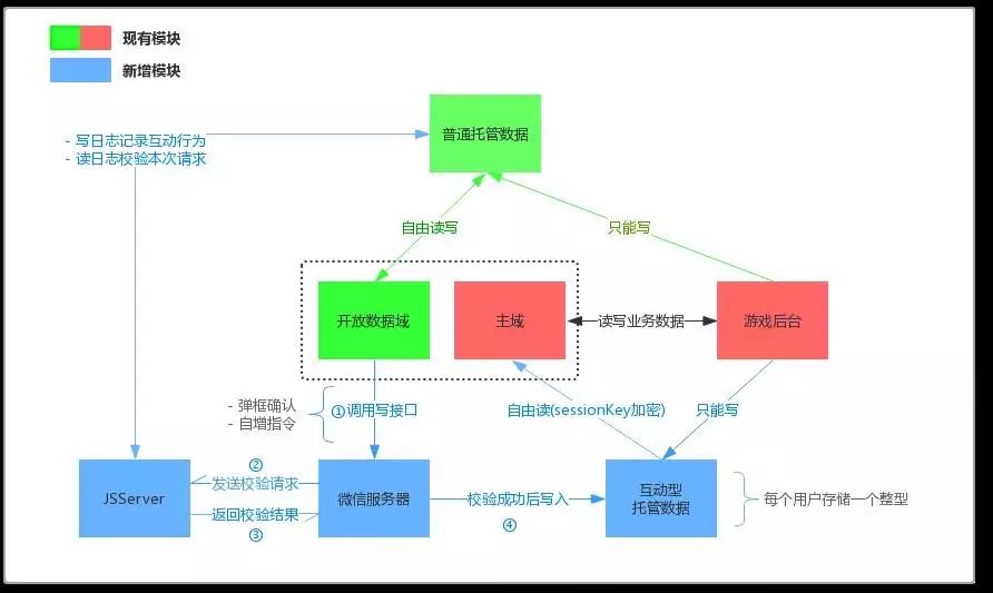 而在JSServer运行环境下,可以调用wx.getOpenId()、wx.getFriendUserStorage()和wx.setFriendUserStorage()这几个接口,此外还可以拿到用户本人openid:wx.getOpenId()、目标好友openid:toUser和增加的数据opNum,这样除了执行校验,还可以顺带将邀请和被邀请记录写入普通托管数据,如下图所示(JSServer的校验逻辑可以参考本文附上的源码):