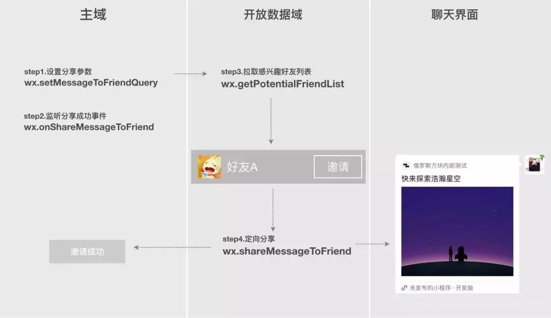 至此,拉取好友、定向分享、监听成功通知的操作就完成了,几个接口的调用顺序如下,我们通过一个图来简单梳理这里的流程: