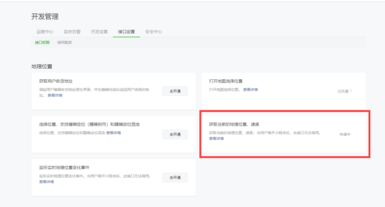 你好,核实到小程序申请wx.getLocation接口审核不通过,根据提交的申请信息可知申请该接口是用于【获取用户当前位置便于填写采样所处地址】,不符合wx.getLocation接口使用场景开放范畴。建议使用wx.chooseLocation或wx.choosePoi实现上述场景。