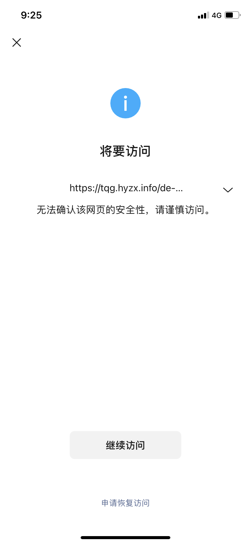 问题描述:扫码链接二维码,提示非微信官方网页,点继续访问也没有跳小程序,1.小程序正确后台已配置普通链接二维码跳小程序2.域名已备案,且已强制https3.小程序已实名已备案且已发布。4.域名是全新注册的,之前也无任何违规记录恳请官方帮忙解决下,如何避免用一段时间重复出现和显示出具体原因然后整改域名:hyzx.info