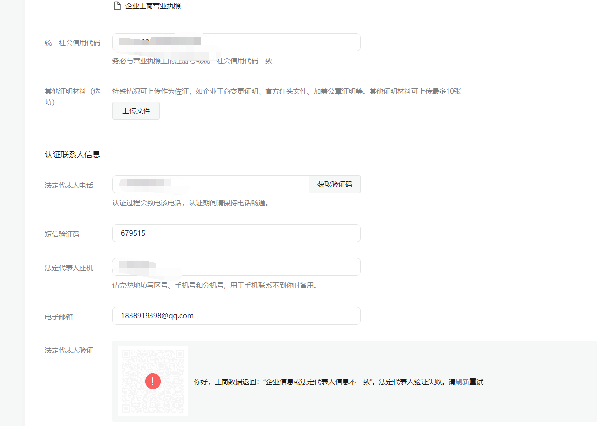 你好,核查发现营业执照上的主体名称与工商系统展示不一致,故法人验证失败。建议到工商局进行修正后重试。