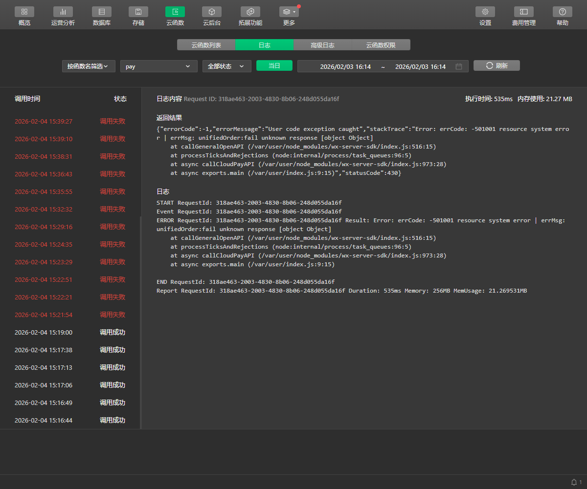 使用小程序云开发的支付接口,之前一直可以使用,今天一直显示调用失败,查看日志,提示了一下错误,代码没有变动,忽然不能成功调用了