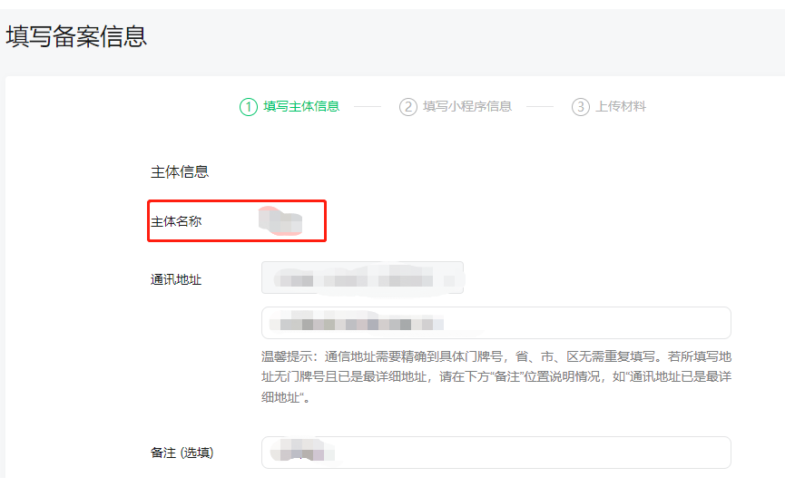 小程序认证的主体是公司名称,备案的时候填了个人名称,主体名称这里没有可修改的地方