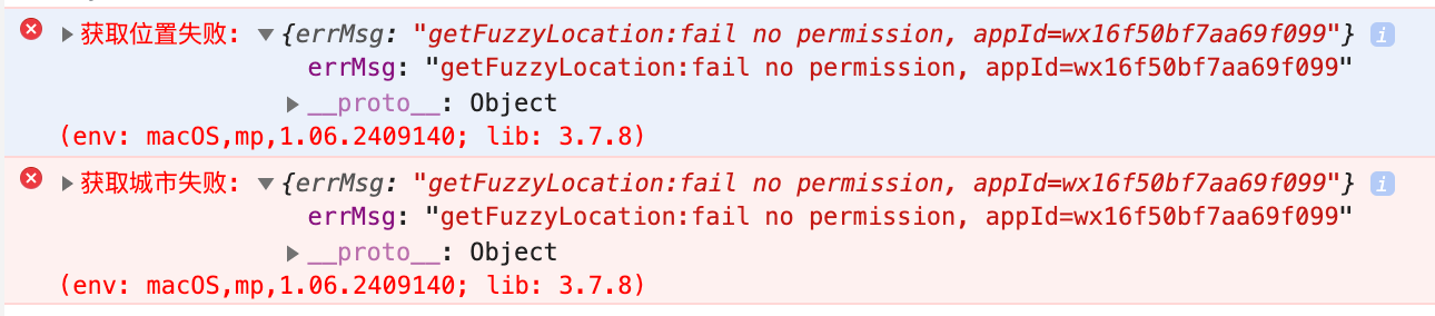 wx.getFuzzyLocation已经申请通过了,app.json中也已经配置了,但在开发工具里测试(1小时后)还是报错说没有权限,是有延迟还是什么其他问题?app_id:wx16f50bf7aa69f099