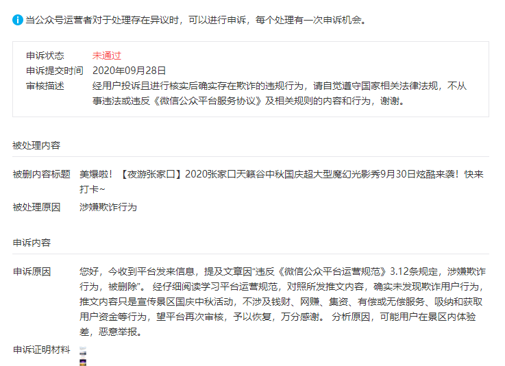 昨天一篇文章被删除了,提示说“存在欺诈行为”申诉了还是一样,但是我反复按条款对照了几遍也没发现哪句话违反了3.12条规定,甚至试着点了一下投诉其他文章欺诈,对照那几项还是没有一条对的上号,现在编辑和运营快打起来了,运营怪管理员在公众号商城里搞促销活动,管理员认为商城促销活动不会影响到文章。商城是有赞商城,文章内没有提及任何销售问题,没有外部连接。