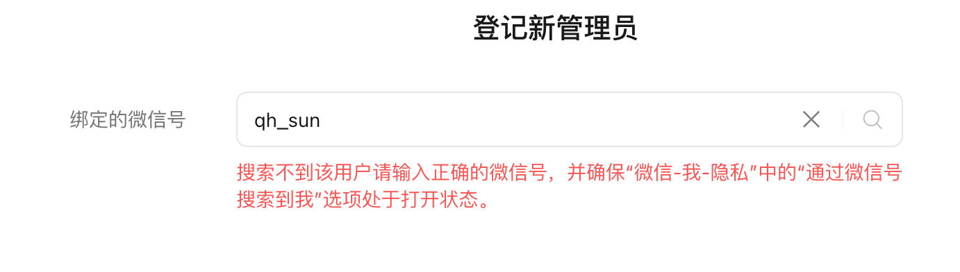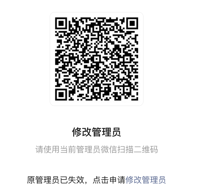 如下图: 在添加其他员工时, 提示管理员已失效, 点击申请“修改管理员”, 申请时, 无法添加新的管理员 (任何微信号都搜索不到)