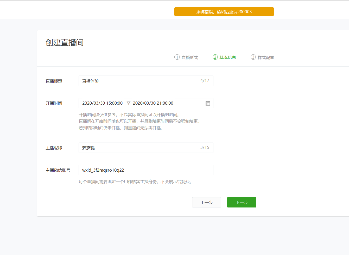 创建直播,设置不了,提交显示系统错我20003,