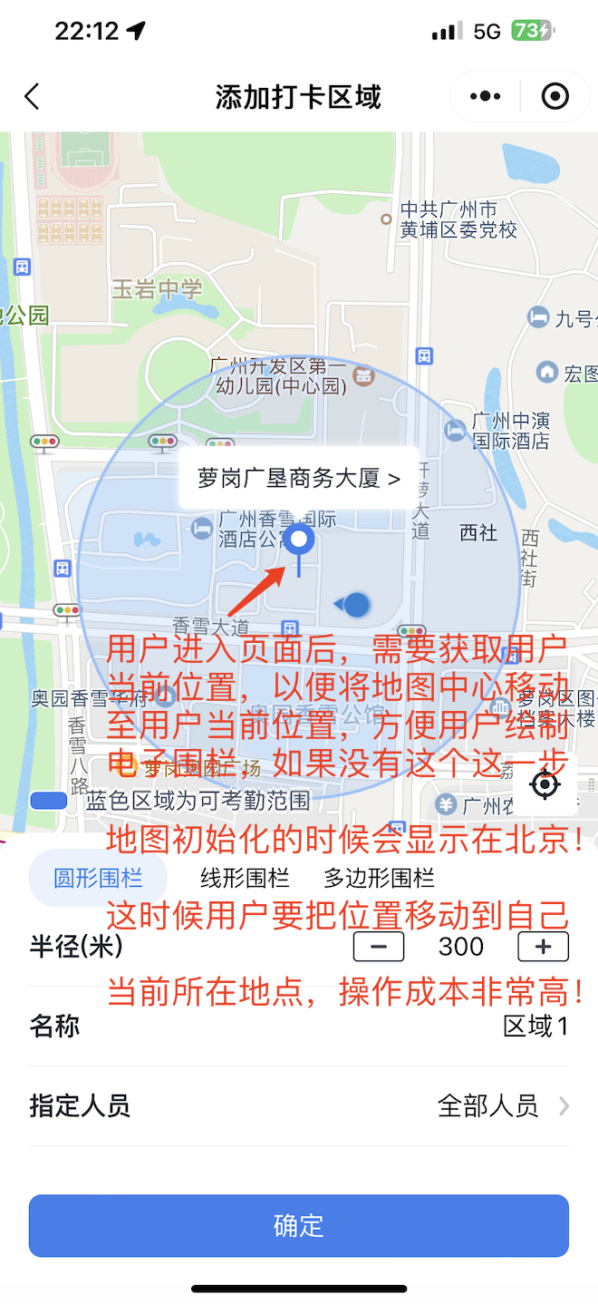 这个标注要定在用户当前位置上,地图的中心也要设置在当前位置,需要getLocation来实现,图片里的小圆点图标,点击也是定位到当前,这个功能也需要用到getLocation,为什么无法确认申请接口的使用场景?电子围栏也是为了设置考勤打卡的范围,符合申请的类目【工具】=》【天气、信息查询、办公、设备管理】=》【与地理位置相关的服务,比如潮汐查询、海拔查询、天气查询、智能穿戴、智能门禁、与地理位置相关的打卡服务等】场景,为啥无法确认申请接口的使用场景呢?