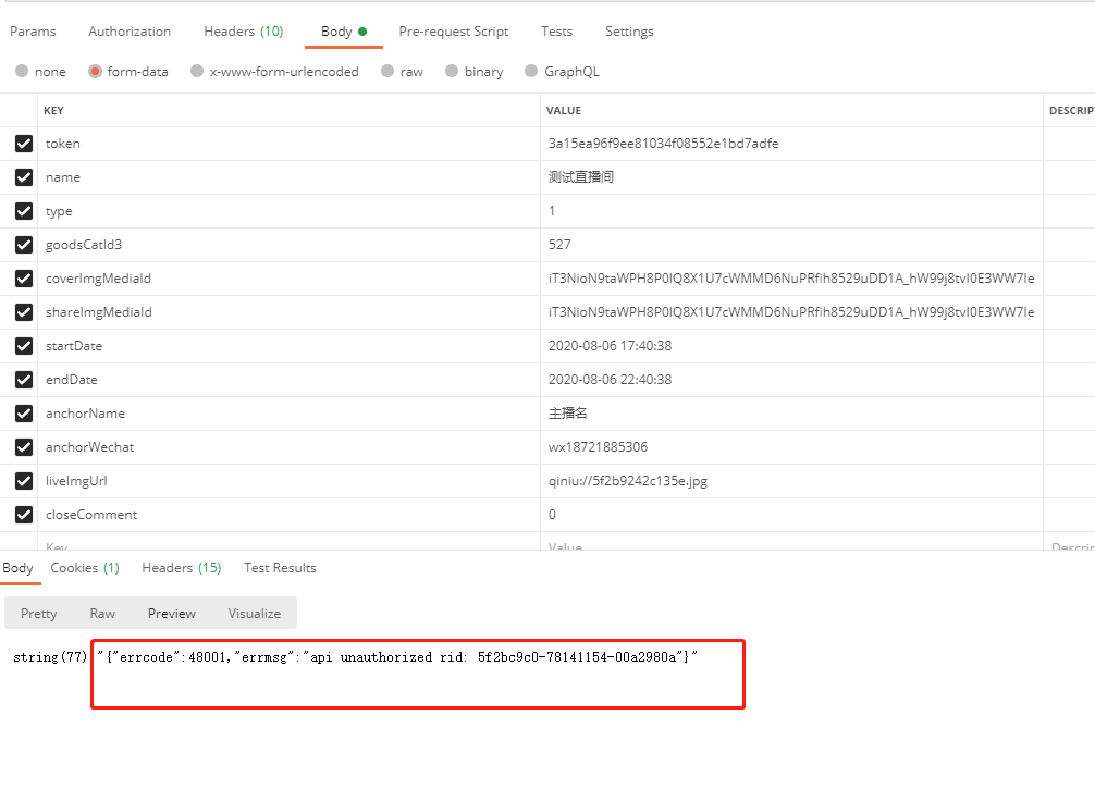 你好,请问你这边是直接调用该接口还是通过第三方平台调用。如果是通过第三方平台调用,请检查下该小程序是否已经给第三方平台授予了小程序直播的权限集(权限集id为52)。 补充,可通过调用api_get_authorizer_info接口查询,返回的func_info中是否包含了52这个id,接口文档请查看:https://developers.weixin.qq.com/doc/oplatform/Third-party_Platforms/api/api_get_authorizer_info.html c此外,也请注意检查token是否传错了,第三方平台有authorizer_refresh_token和component_access_token,请注意区分。