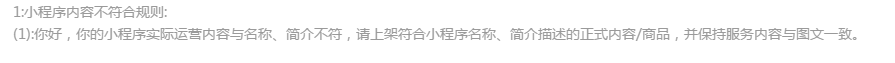 你好,经核实,贵方小程序实际运营内容确实与名称简介不符,请上架符合小程序名称简介描述的正式内容/商品,并保持图文一致。