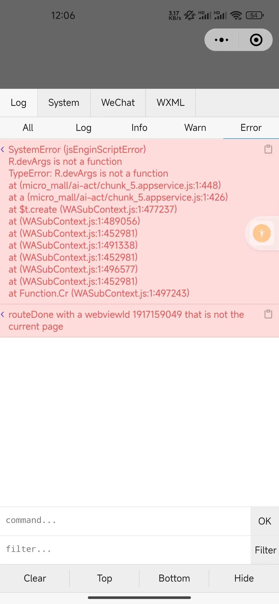 at Function.Cr (WASubContext.js:1:497243) {type: "string", description: "SystemError (jsEnginScriptError)\nR.devArgs is not a function\nTypeError: R.devArgs is not a function\nat (micro_mall/ai-act/chunk_5.appservice.js:1:448)\nat a (micro_mall/ai-act/chunk_5.appservice.js:1:426)\nat $t.create (WASubContext.js:1:477237)\nat (WASubContext.js:1:489056)\nat (WASubContext.js:1:452981)\nat (WASubContext.js:1:491338)\nat (WASubContext.js:1:452981)\nat (WASubContext.js:1:496577)\nat (WASubContext.js:1:452981)\nat Function.Cr (WASubContext.js:1:497243)", value: "SystemError (jsEnginScriptError)\nR.devArgs is not a function\nTypeError: R.devArgs is not a function\nat (micro_mall/ai-act/chunk_5.appservice.js:1:448)\nat a (micro_mall/ai-act/chunk_5.appservice.js:1:426)\nat $t.create (WASubContext.js:1:477237)\nat (WASubContext.js:1:489056)\nat (WASubContext.js:1:452981)\nat (WASubContext.js:1:491338)\nat (WASubContext.js:1:452981)\nat (WASubContext.js:1:496577)\nat (WASubContext.js:1:452981)\nat Function.Cr (WASubContext.js:1:497243)"}