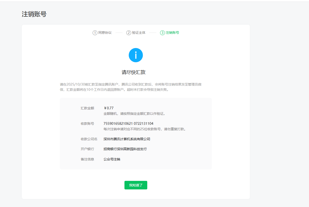 你好,核实该账号打款验证已通过。账号目前处于自主注销冻结期,冻结期满后管理员确认注销即可。
