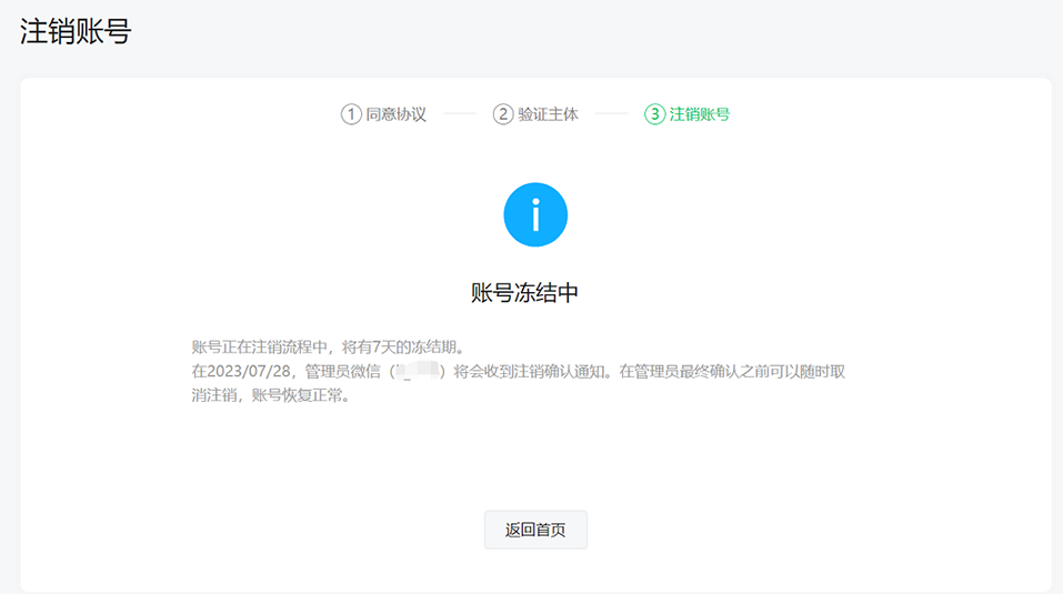 目前管理员确认注销有效期为7天,且每天都会下发提醒,建议您留意下一次的消息提醒。若已确认,将不会再下发消息提醒。管理员确认注销后,账号完成注销。