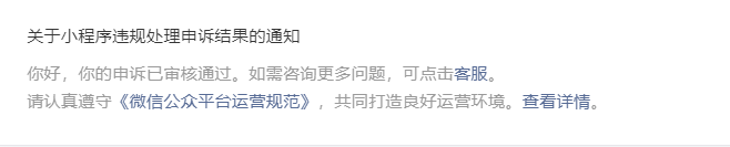 23号通知功能违规,然后我修改,点击了申诉审核也通过了,然后25号直接封了功能,那请问我这个申诉有啥意义?而且这种封禁功能不应该微信提示一下开发者吗?然后也没有加急申诉