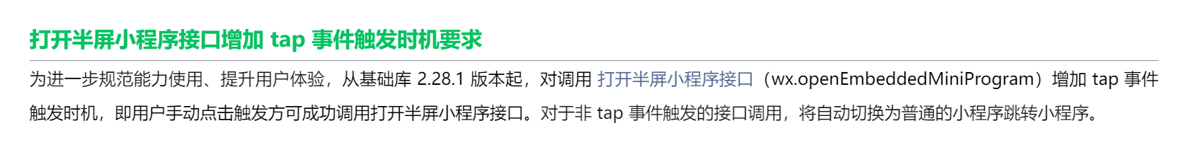 从基础库2.28.1版本起,需要tap事件才能触发半屏小程序,参考:https://developers.weixin.qq.com/community/develop/doc/000224a6914cf89243ee4b0e257801?blockType=1