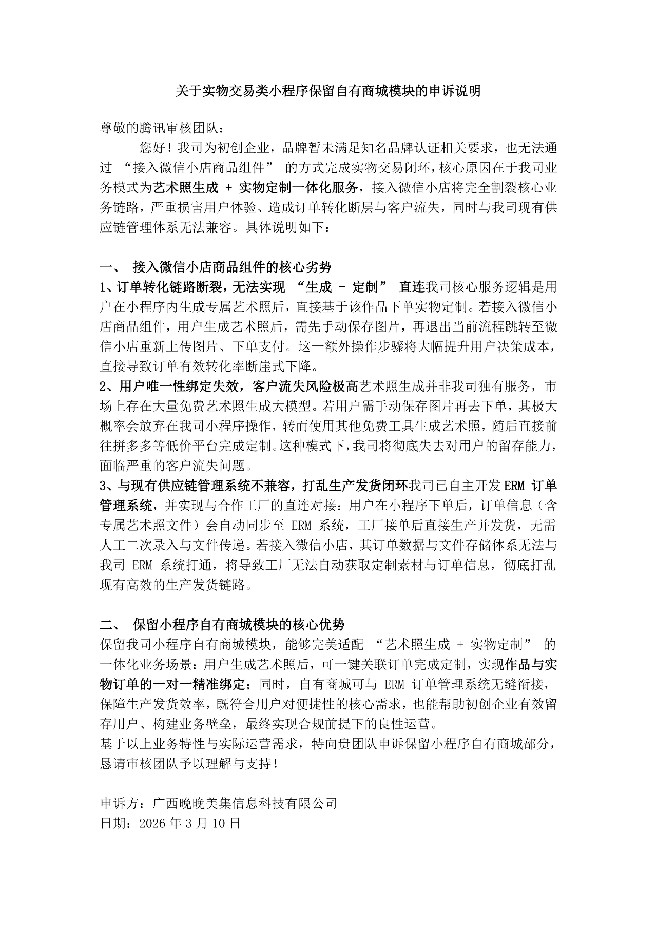 本人于去年注册公司,投入6万余元资金,先后完成了技术团队搭建、AI大模型对接、多轮技术测试、小程序开发上线、供应链(工厂)对接等一系列复杂工作。所有工作的最终目的,就是为了通过腾讯广告平台进行付费推广,获取实物定制订单,实现商业闭环。我方并非无偿占用微信流量,而是希望通过真金白银的投入,与平台达成互利共赢的合作关系。