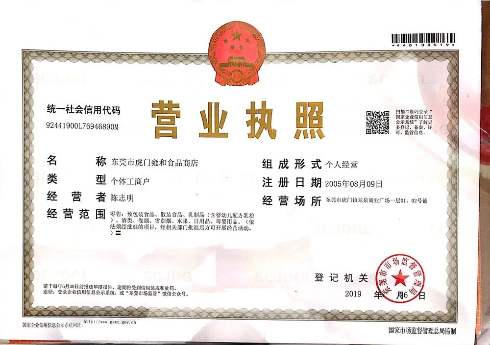 主体信息:东莞市虎门雍和食品商店