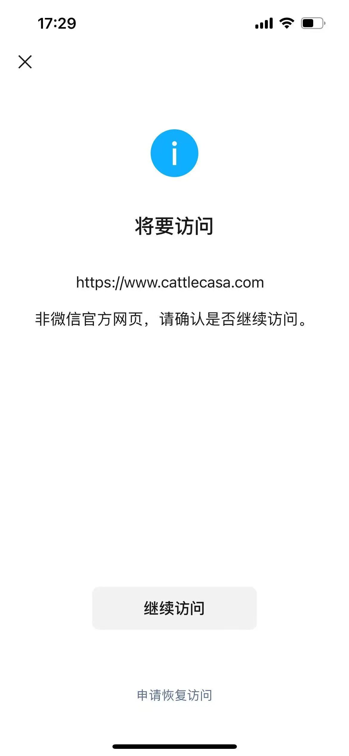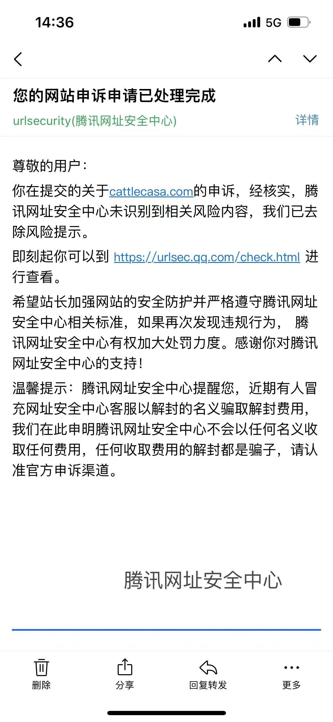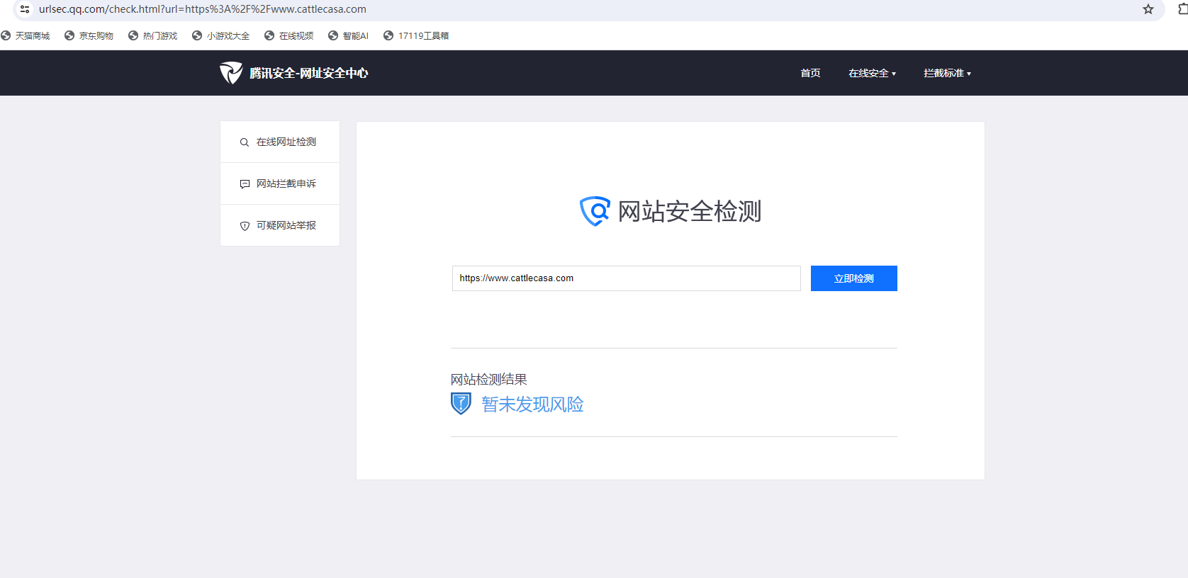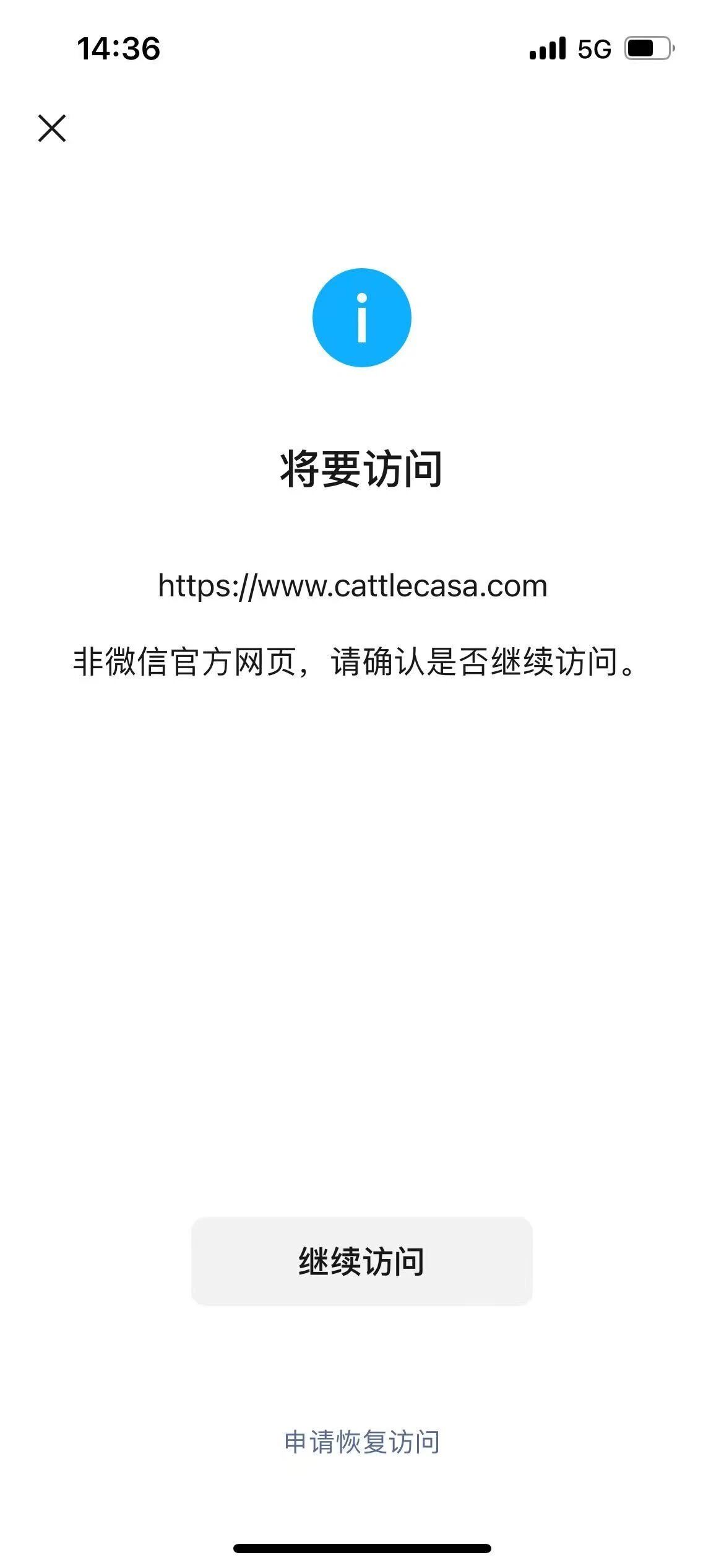 你好,经核实,域名cattlecasa.com手机管家拦截,此处只处理被微信暂停提供微信内直接访问的服务的外部链接的申诉问题,建议登录手机管家官网【http://gj.qq.com/online_server/complain_url.html】自行申诉,知悉。
